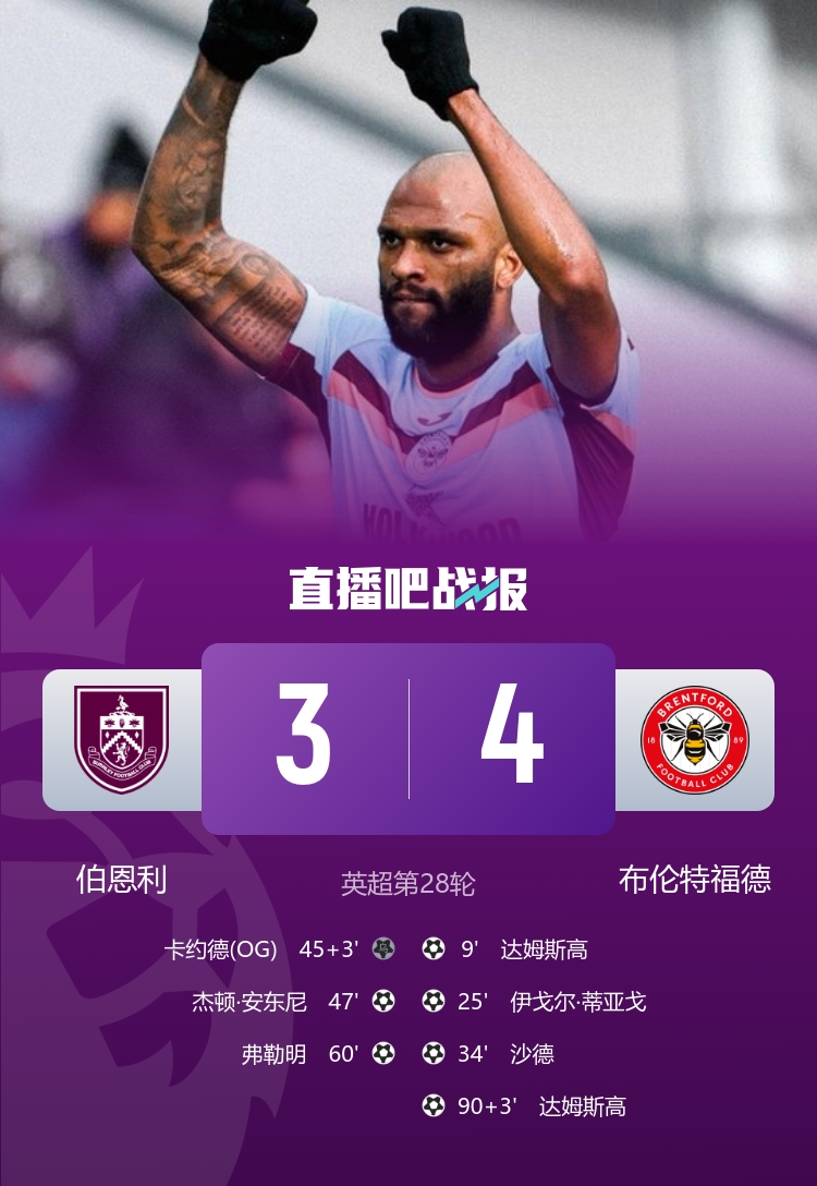 伯恩利3-4布伦特福德,本场伯恩利连丢3球后一度扳平,布伦特福德补时绝杀。本场比赛尾声多次出现反转剧本,堪称跌宕起伏。