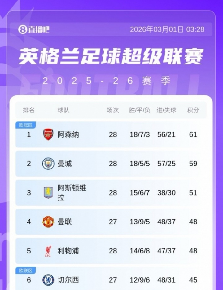 英超争冠日趋白热化,最新比赛后,曼城距榜首阿森纳2分。